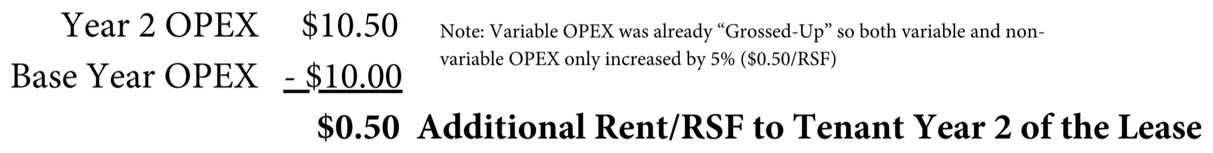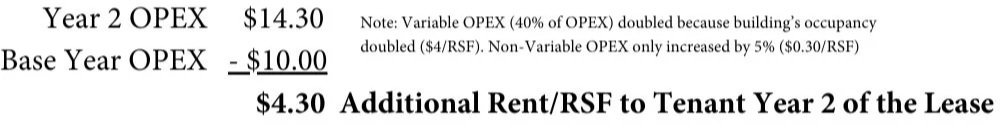 See the differences in our Tenant’s Year 2 Operating Expenses (OPEX) with and without a Gross-Up provision in their lease when the Building’s occupancy increased from 50% to 100% between our Tenant’s Lease Year 1 and Lease Year 2.