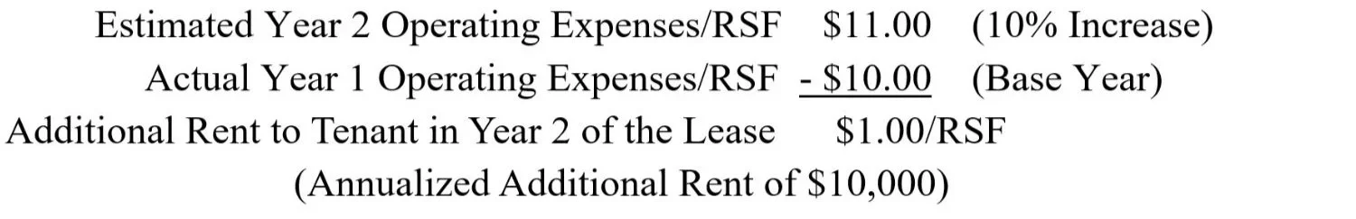 While often defined differently between Landlords and Tenants, the “Base Year” is, essentially, the calculation of actual operating expenses incurred by the Landlord during the calendar year in which the Tenant’s lease commences. In the example above, the $10.00/RSF allocation toward operating expenses would be known as the “Base Year”. It serves as a “stop” amount, allowing the Landlord to “pass through” to the Tenant, actual expenses incurred, which exceed the Base Year stop amount, over subsequent calendar years in the lease. Many factors can contribute to annual increases in operating expenses including inflation and increases or reductions in building services.